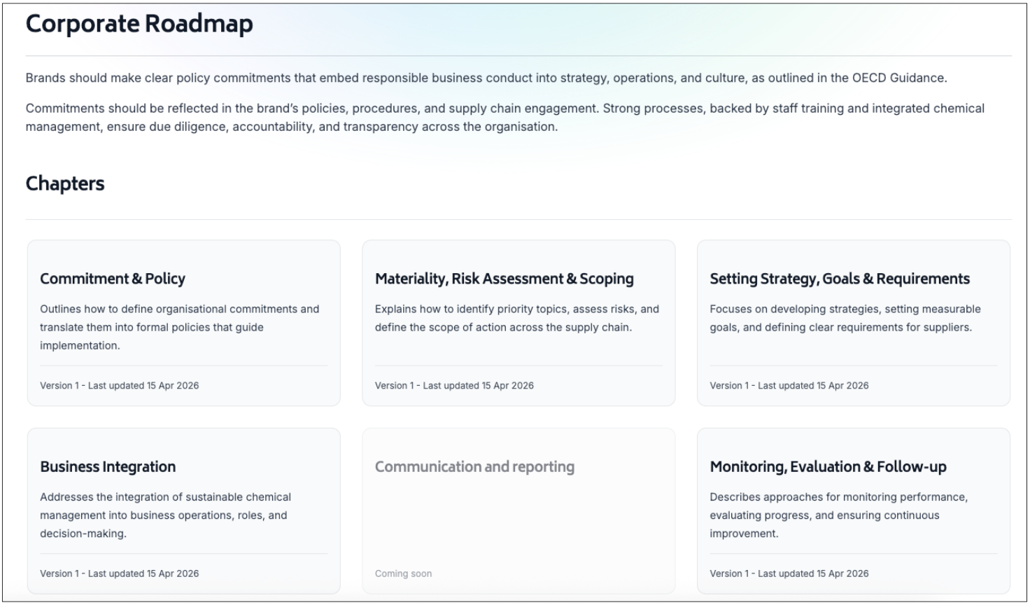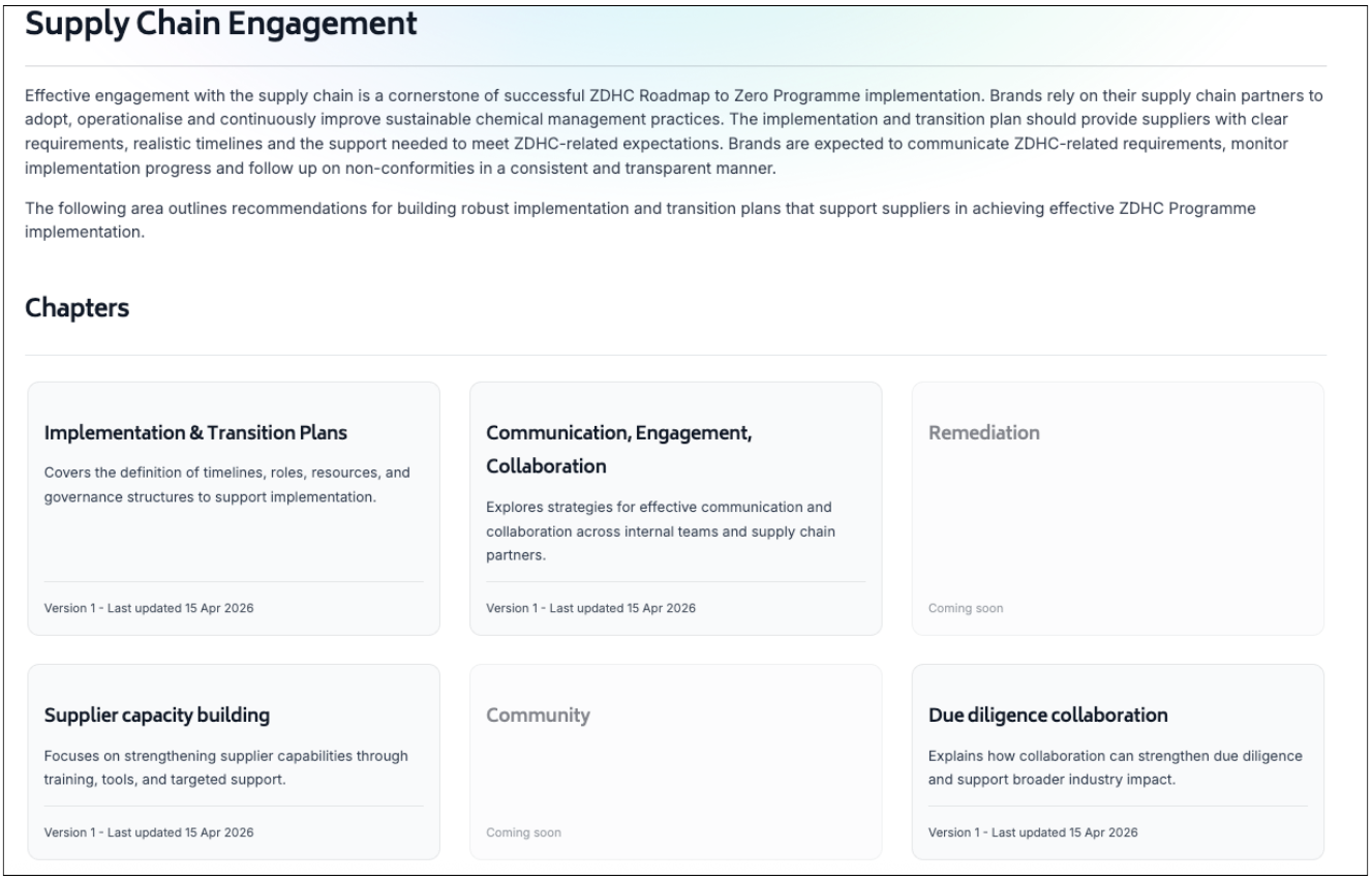 Within these chapters, brands are guided on how to onboard suppliers, set expectations, support implementation and strengthen collaboration across the Programme.