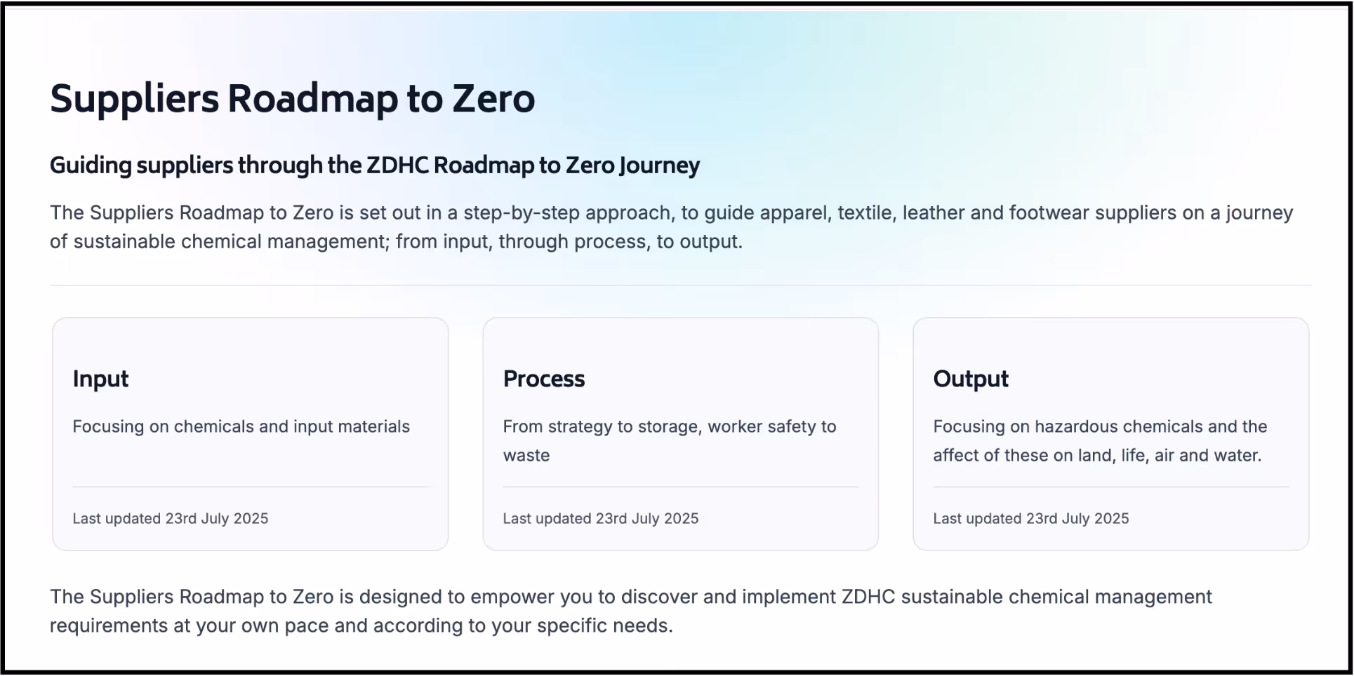 All supplier requirements for implementing the ZDHC Roadmap to Zero Programme will be available in one place.
