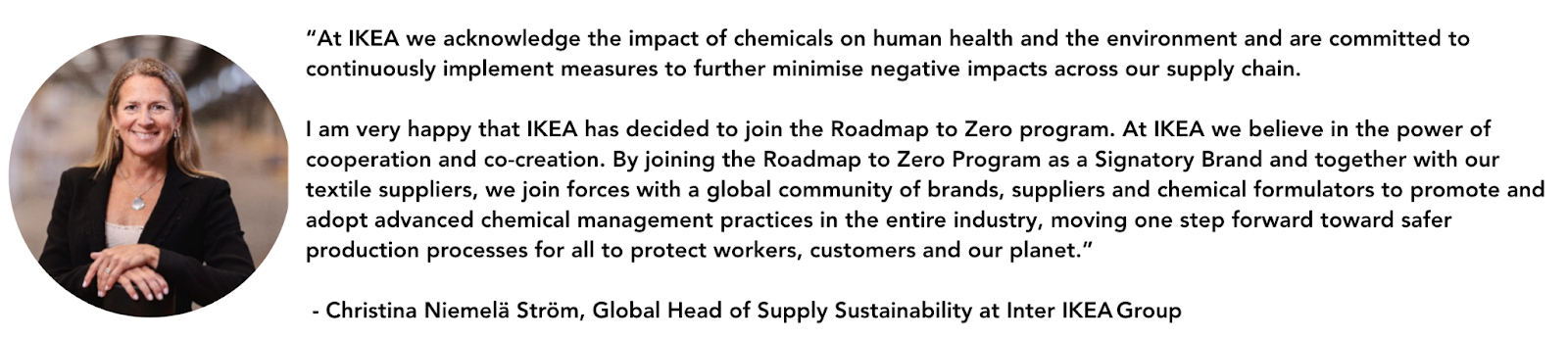 By joining the ZDHC Roadmap to Zero Programme, the Inter IKEA Group is reinforcing its sustainable chemical management approach, an integrated part of the IKEA sustainability strategy. The company aims to reduce negative pressures and impacts on nature across its value chain, while contributing to the protection, improvement and enhancement of natural ecosystems in their sphere of influence.